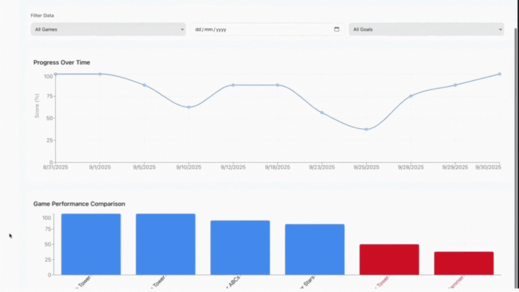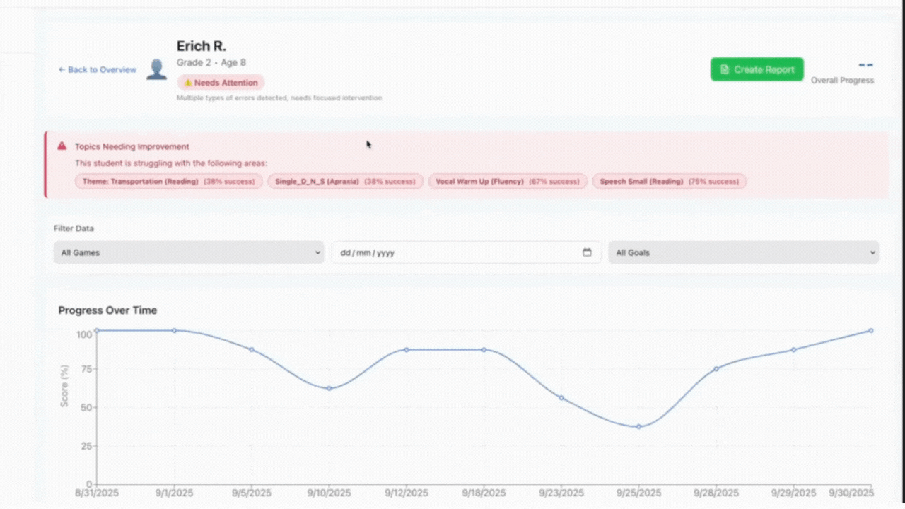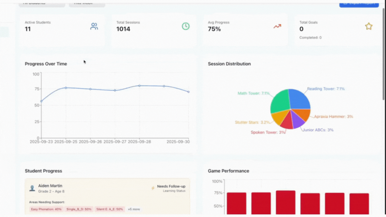 Teachers can instantly view individual or group progress, filter by grade or skill, and generate reports that align with IEP or RTI documentation.
